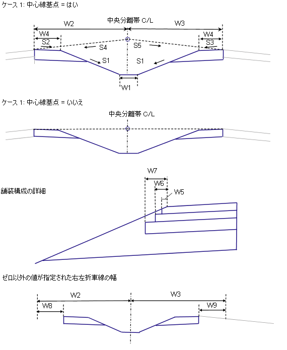 横断勾配摺り付けまたは右左折車線によって排水溝勾配の上端標高が左右で異なるために、排水溝の位置が中心から左右どちらかにずれる場合があります。この場合には、2 つのオプションが用意されています。[排水溝の勾配を保持]を[はい]に設定すると、左右両側で指定した排水溝の勾配値が固定され、排水溝の底部が中心から上端標高の低い勾配側に移動します。[いいえ]に設定すると、排水溝の底部が中央分離帯の中心になるよう調整されます。また、上端標高が低い側の勾配が固定され、高い側の勾配はそれに合わせて調整されます。