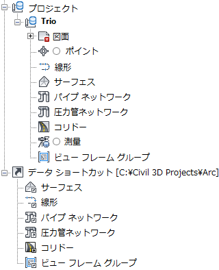 図は Trio という Vault プロジェクトと Arc というデータ ショートカット プロジェクトのコレクションを示しています。どちらのプロジェクト タイプも既定のプロジェクト テンプレートから作成されています。したがって、サーフェスや線形などのオブジェクトについては同じコレクションを持っており、各オブジェクトは複数の図面で参照することができます。