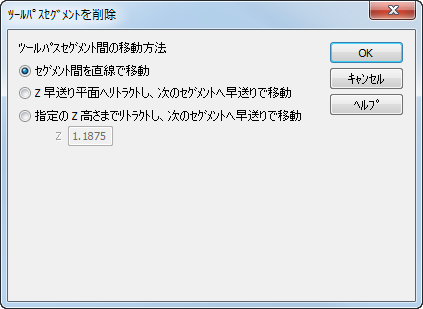 フライス加工の フィーチャー プロパティ ダイアログ、ツールパス タブの セグメントを削除 をクリックして、ツールパス セグメントを削除 ダイアログを表示します。