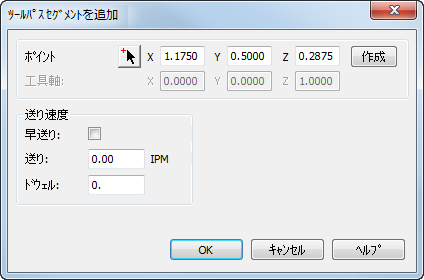 このダイアログを使用して、現在選択されているポイントの前に新規ポイントを挿入します。作成する各ポイントの新規 ポイント 座標を入力し、送り を指定するか、早送り オプションを選択します。任意で ドウェル (秒)を入力し、作成 ボタンをクリックします。ポイントを作成したら、OK をクリックします。