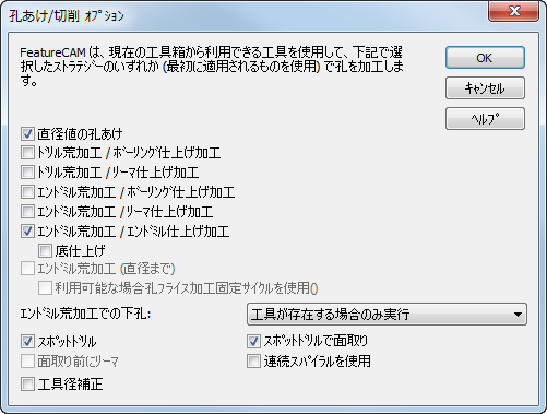 複数のストラテジーを選択した場合、FeatureCAM は、リストの上から順に孔を完成させられるストラテジーを検出します。