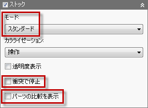 [標準]モードを選択すると、[衝突で停止]チェック ボックスおよび[パーツの比較を表示]チェック ボックスが表示されます。軸、ホルダー、固定具の間で衝突が発生した場合にストック シミュレーションを停止するには、[衝突で停止]チェック ボックスをオンにします。ストックおよびパーツの比較を表示するには、[パーツの比較を表示]チェック ボックスをオンにします。赤はパーツの干渉を示し、青は余分なストックを示します。