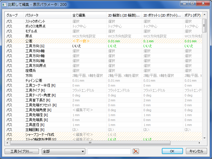 [比較して編集]ダイアログ ボックスが開き、各行に使用できるすべてのパラメータが一覧表示され、それらの各列に選択したそれぞれの操作が表示されます。また[すべて編集]の列は、すべての操作のパラメータに同じ値を設定することができます。