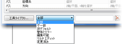 [フィルタ]テキスト ボックスに文字列を入力すると、文字列に一致する名前を持つパラメータのみが表示されます。たとえば、「工具」と入力すると、工具に関連するすべてのパラメータが表示されます。部分名も許可されています。例として、「傾斜」と入力すると、[傾斜]、[傾斜開始角度]、[傾斜終了角度]パラメータが表示されます。