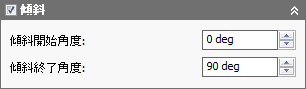 傾斜制限は、[図形] タブの[傾斜]セクションにある[傾斜開始角度]および[傾斜終了角度]パラメータの設定によって指定します。