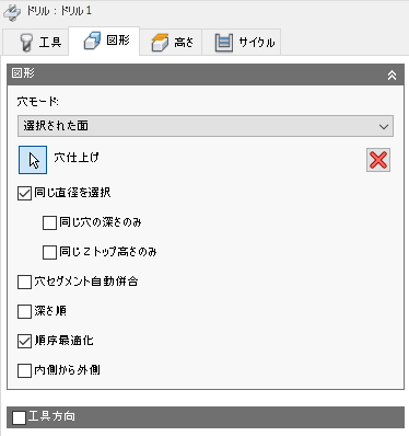 ドリル用に選択された面の数が含まれています。これはモデルに基づいたフィーチャ選択に使用されます。現在選択したすべての項目をオフにするには、X を使用します。