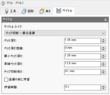 ドリル サイクルを選択することにより、ドリル操作でどのパラメータを指定できるのかが決まります。