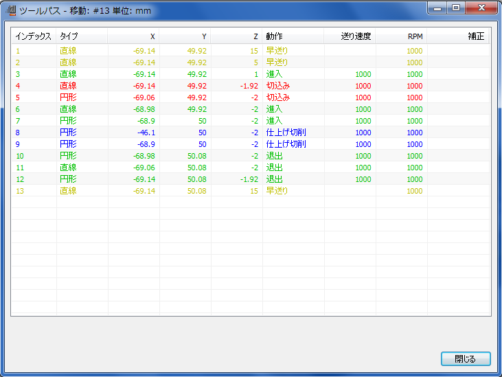 [ツールパスを見る]ダイアログ ボックスには、送りと速度、動作のタイプ、工具補正、移動座標など、個々の動きに関する情報が表示されます。