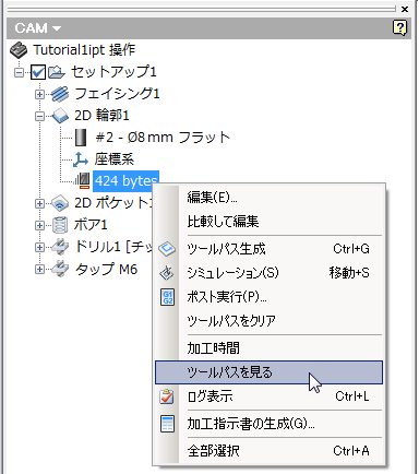 [ツールパスを見る]は、リスト形式でツールパスに関する低レベルの情報を提供します。この情報は、場合によっては、ツールパスを実際にシミュレートするよりも便利なことがあります。操作のツールパス コンポーネントを右クリックし、ポップアップ コンテキスト メニューから [ツールパスを見る]を選択することで、CAM ブラウザから使用できます。