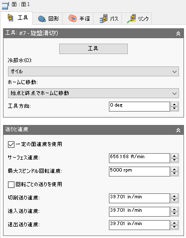 切削速度は、パーツのサーフェス上の工具の速度として表されます。フィート/分またはメートル/分で、現在の[単位]の設定に基づいて表されます。