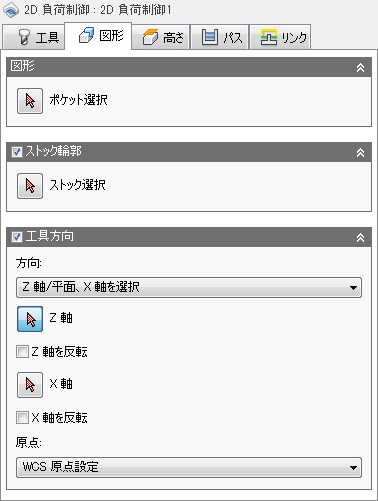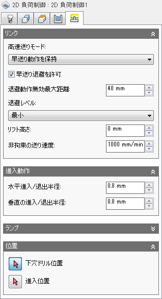 [正の仕上げ代]: 後続の粗取りまたは仕上げ操作で削除すべき、操作後の残りストックの量です。粗取り操作のために、既定値は少量の材料を残します。