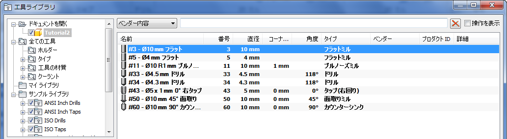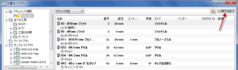 [操作を表示]を有効にした工具ライブラリ: 工具一覧に工具と操作の両方が表示されています