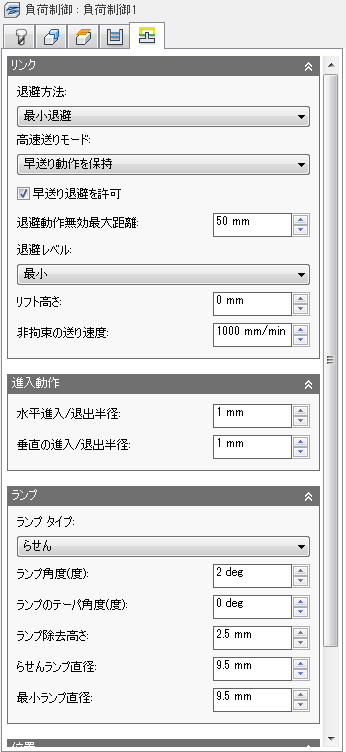 らせんランプのテーパ角度を指定します。工具軸をストックからわずかに離し、ランプ時のチップ排出を改善するには、この設定を使用します。