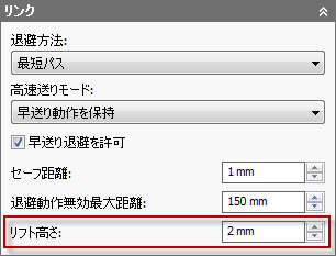 [リフト高さ]設定は、[リンク]タブの 2D および 3D の[ポケット]、[負荷制御]、[平坦部加工]方法で使用することができます。