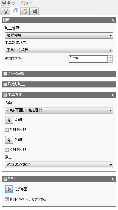 既定では有効になっています。操作で選択したモデルのサーフェスに加えて、セットアップで選択したモデルも含まれます。このチェック ボックスをオフにすると、操作で選択したサーフェス上にのみツールパスが生成されます。