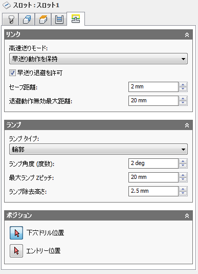 [正の仕上げ代]: 後続の粗取りまたは仕上げ操作で削除すべき、操作後の残りストックの量です。粗取り操作のために、既定値は少量の材料を残します。