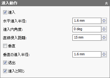 [進入]と[退出]設定を変更し、0 度のスイープを使用します。これにより水平進入の円弧がドロップされ、直線進入のみが切削パスに対して接線方向に実行されます。垂直の円弧は保持されます。