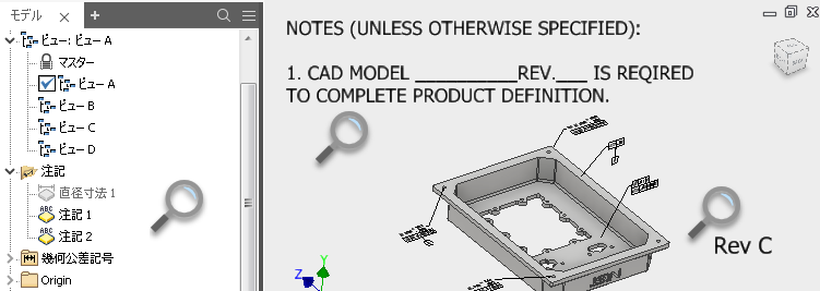 ヒント: Inventor 内では、3D モデルに追加したコメントは回転せず、常にアクティブなビューに対して垂直です。エクスポートされた PDF ファイル内の注記は、ビューと共に回転します。最良の結果を得るには、サンプルとして次のイメージを参照し、エクスポートする前に次の手順を実行します。