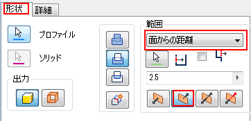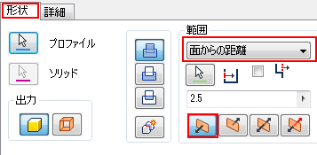 [形状]タブで[面からの距離]と、[方向 1]または[方向 2]を選択した状態で[詳細]タブのオプションを使用することで、さまざまな結果が得られます。