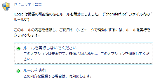 Inventor によって安全でない可能性があると判断されたルールを実行しようとすると、セキュリティ警告が表示されます。ルールを安全なものとして実行するか、ルールを実行しないかを選択できます。[ルールを実行]を選択した場合、iLogic セキュリティ アドバイザが表示され、不明なコードを管理するための追加オプションが含まれている[iLogic セキュリティ]ダイアログ ボックスにアクセスできます。