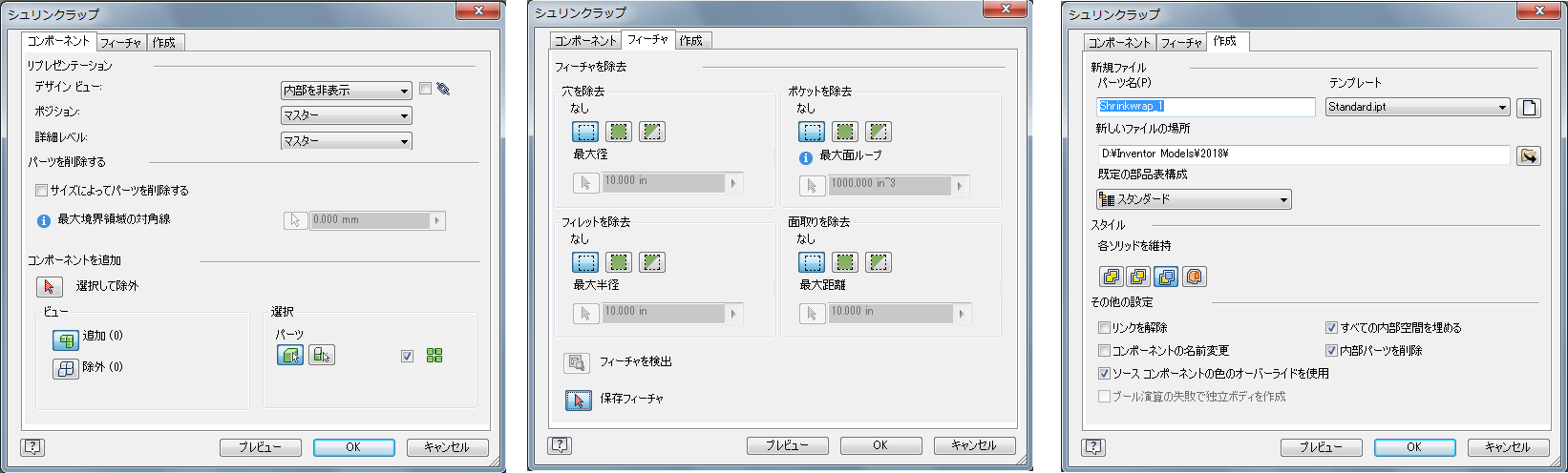 シュリンクラップを初めて使用する際、従来の動作に慣れている方は、ダイアログ ボックスが統合されていることに気づくと思います。3 つのタブを持つ単一のダイアログ ボックスがあります。