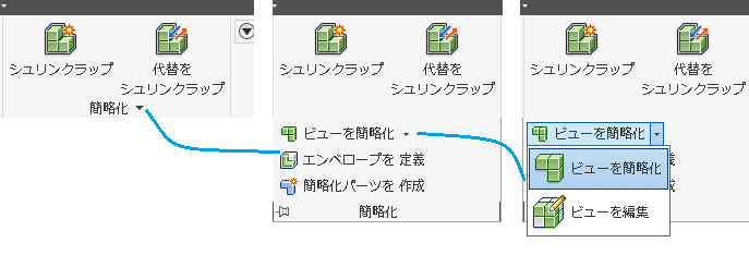 アセンブリ ドキュメントで、[簡略化]タブが廃止され、コマンドが[簡略化]パネルに移動しました。英語版の[Simplification]パネル([簡略化]パネル)は、以前は[Simplify]パネルでした。