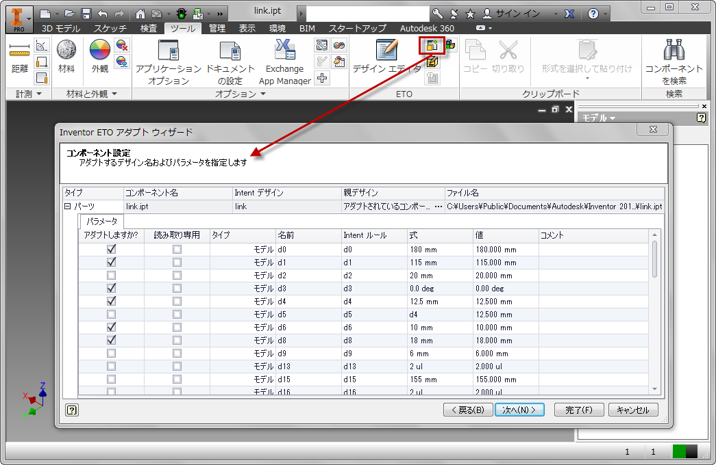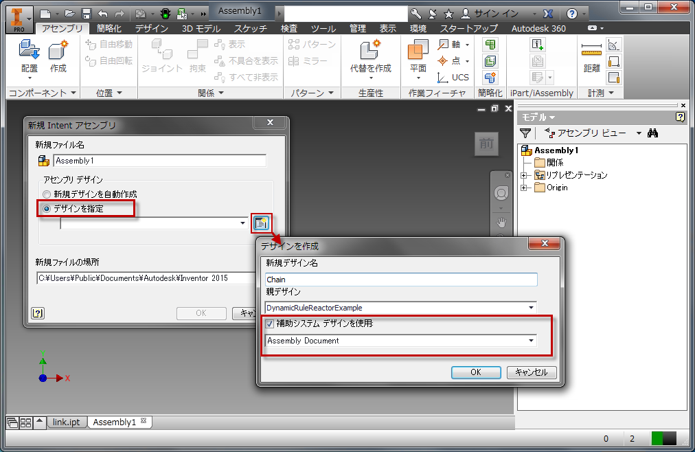 デザインを保存した後、Inventor でアセンブリにリンクを追加します。