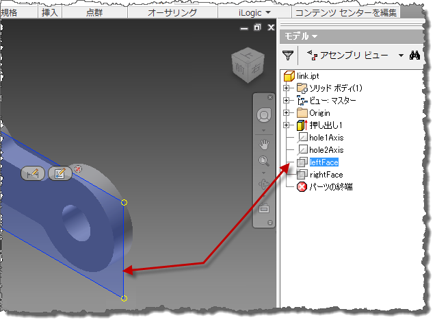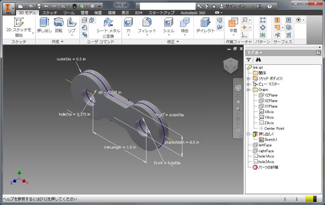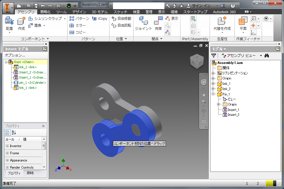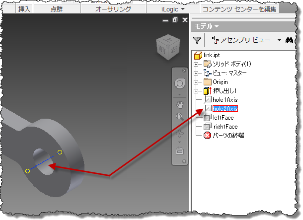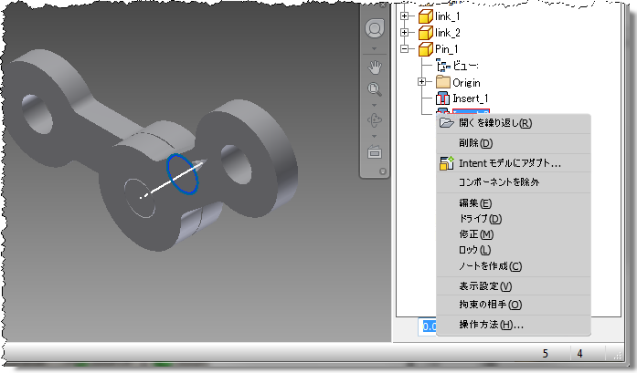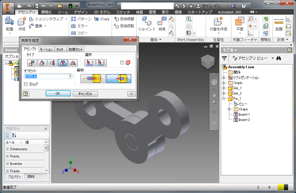 モデルのピンおよび 2 つのリンクを使用し、Inventor の 2 つの挿入拘束でピンとリンクを拘束します。