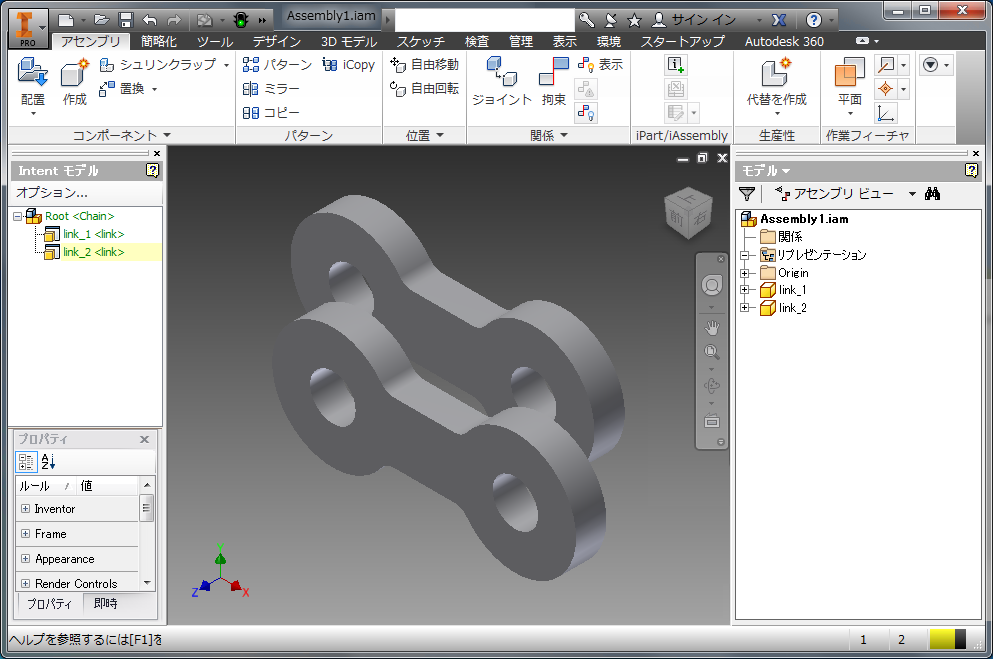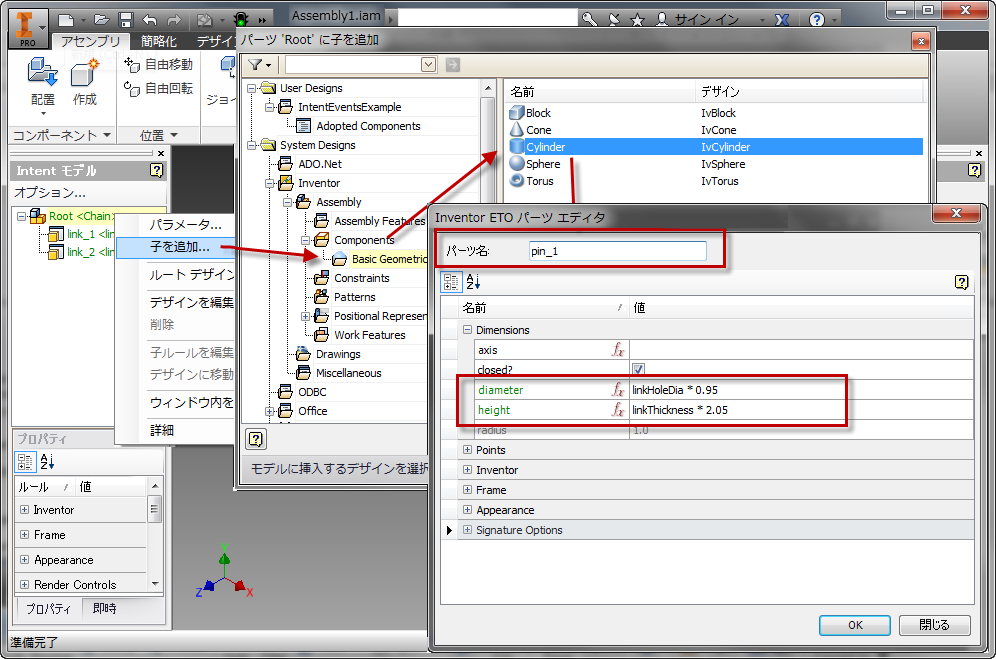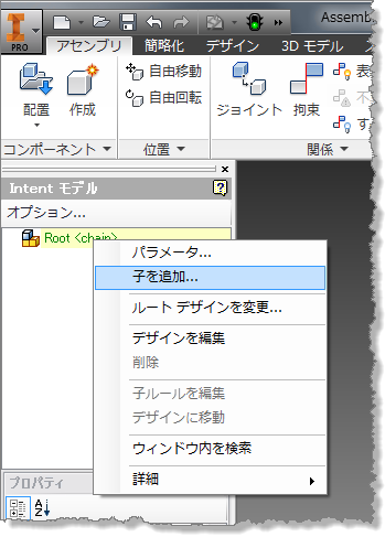 ここでアダプトされたリンクと円柱プリミティブを使用してチェーンをアセンブルします。新しいルート デザインで新しい Intent アセンブリを作成することにより開始します。