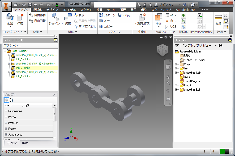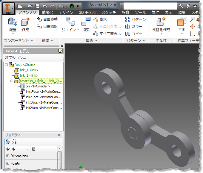 2 つのリンクをピンで拘束するには、既知の論理的な方法があるため、リンクが自動的に作成された場合はこの方法が最適です。コンポーネント グループでピンと必要な拘束を収集することで、"スマート" ピン デザインを作成することができます。はじめに、IvComponentGroup に含める新しいデザインを作成します。