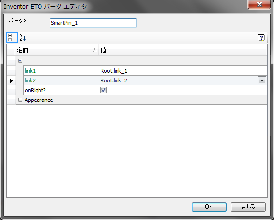 ここで、SmartPin の子を追加し、パーツ エディタで link_1 と link_2 を選択します。