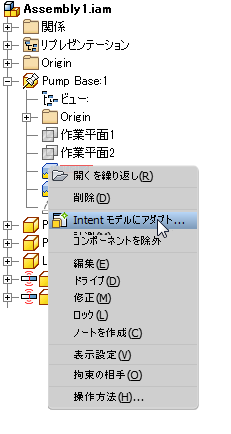 1. ブラウザ アセンブリ構造で、選択した Inventor フィーチャを右クリックし、右クリック メニューで[Intent モデルにアダプト]をクリックします。