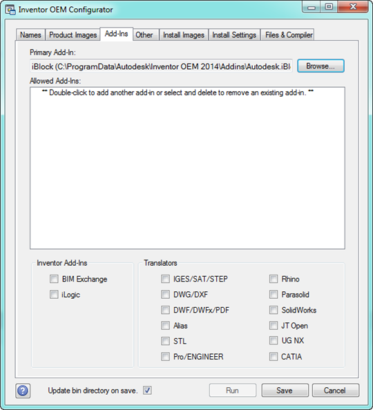 注: OEM コンフィギュレータを使用して ETO アプリケーションを作成すると、Intent Inventor アドインが[許可するアドイン]の一覧に自動的に追加されます。