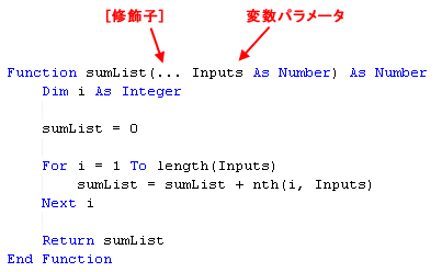 関数ごとに 1 つの変数パラメータのみを使用可能で、宣言の最後のパラメータにする必要があります。変数パラメータで ... モディファイヤを省略すると、コンパイル時エラーが発生します。オプションのタイプ名を指定した場合、一覧内の各要素のタイプを示します。一覧にさまざまなタイプのパラメータが記述されている場合には、タイプ任意を使用します。