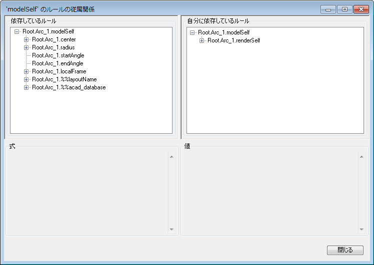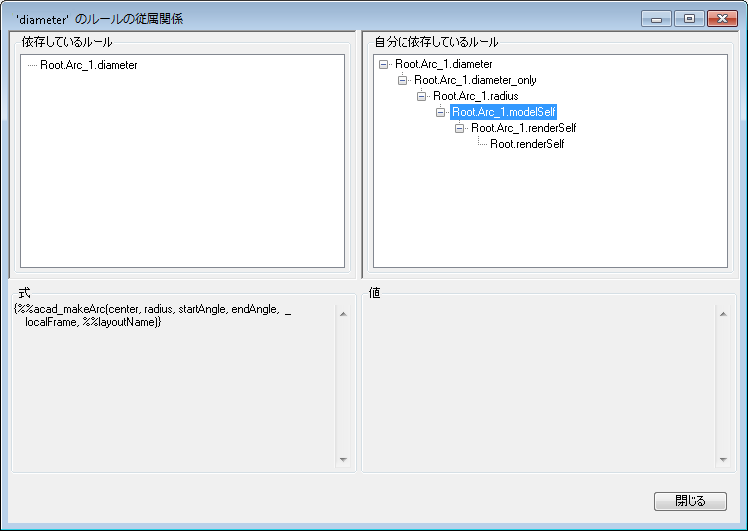 [式]には、ツリーで選択したノードの式が表示されます。この例では、"diameter" は単純な数値パラメータで、他のルールには依存していません。選択されている modelSelf ルールは diameter に依存していますが、依存は間接的です。このルールは直径ではなく半径を参照する内部関数呼び出しです。ただし、グループ ルール diameter_only は円弧の半径を取得するためにトリガされます。