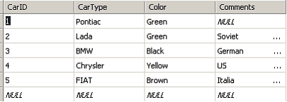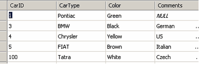 Intent >AddRow({100,"Tatra","White","Czech"}) ‘Add new car