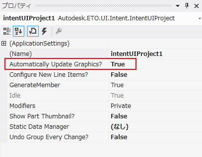 既定では、IntentUIProject は、Intent モデルへの変更が行われたときに自動的に更新するためのグラフィックスを発生しません。この動作は、時間がかかる 1 つずつのグラフィックスの更新を待たずに一連の変更を実行できるようにします。ただし、サンプル プロジェクトはシンプルなため、著しいパフォーマンス負荷をもたらさずに自動更新可能です。フォームに追加した IntentUIProject に移動して、[プロパティ]で[グラフィックスを自動的に更新しますか ?]をTrue に設定します。