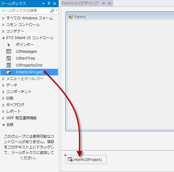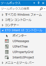 IntentUIProject コントロールは、UI ツールのコントローラとして使用されます。プロジェクト レベルのすべての情報が格納され、すべての UIParts を管理します。他の UI ツール コントロールを機能させるには、IntentUIProject をツールボックスからフォームにドラッグして UI に追加します。