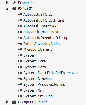 UI ツール コントロールをアドイン フォームに追加する前に、最初に Visual Studio 2010 プロジェクトに UI ツール アセンブリへの参照を追加します。UI ツールを使用する必要がある 2 つの DLL 参照、Autodesk.ETO.UI.dll、Autodesk.ETO.UI.Intent.dll があります。コア Intent Autodesk.Intent.API.dll、および Autodesk.IntentBase.dll アセンブリへの参照も必要です。最後に、この UI は Inventor のアドインとして実行されるため、Autodesk.Inventor.Interop.dll への参照が必要です。