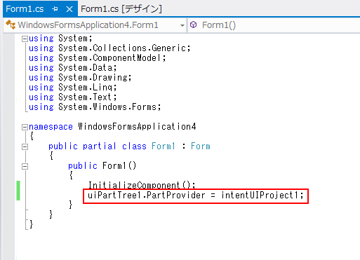 いくつかのコントロールは、IPartProvider を実装し、また PartProvider をプロパティとして受け入れます。UIPartTree はその一例です。PartProvider プロパティを設定することにより、UIPartTree のルート ノードを設定します。この場合は、UIPartTree をモデル全体にするために、以前追加した IntentUIProject に PartProvider プロパティを設定します。UIPartTree のルートはモデルのルート UIPart であるため、選択した IntentUIProject の UIPart は常にルートになります。