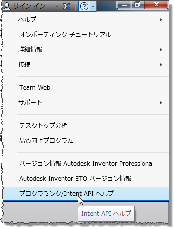 Inventor と同様に、Intent API のマニュアルが既定の場所の C:¥Program Files¥Autodesk¥Inventor ETO Components 2016¥Help¥IntentAPI.chm にローカルでインストールされています。このイメージに示すように、Inventor で[ヘルプ]メニューから直接このファイルを開くことができます。