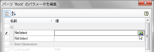 SelectFile エディタを指定すると、パーツ エディタ内の関連する[値]フィールドに[参照]アイコンが表示されます。
