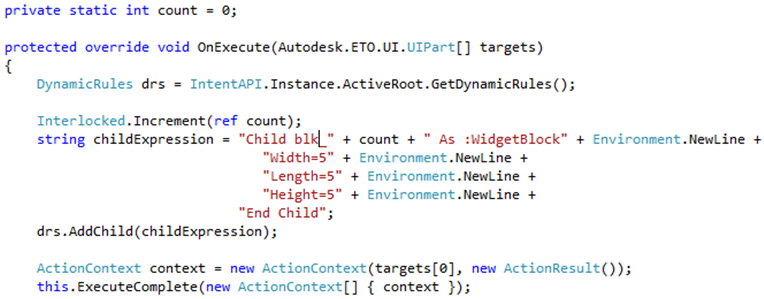 targetsと呼ばれる渡されたパラメータはパーツの配列ですが、これには常に 1 つの項目、UIPartsTree で選択されたパーツが含まれます。IntentAPI が使用可能であることに注意してください。このメソッドの最後に、ExecuteComplete()メソッドを呼び出す必要があります。これは、アクションが完了し、UI が更新できることを UITools に通知します。