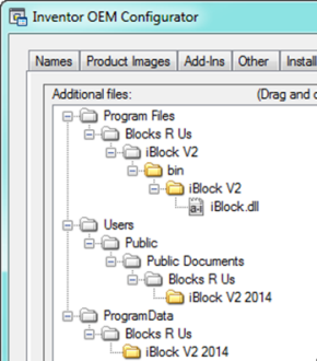 最初に、お使いのコンピュータのインストーラがインストールすると予想される場所に、インストーラに含めるファイルをコピーします。iBlock のサンプルでは、iBlock ファイルのフォルダを Inventor OEM 2014¥SDK¥Samples¥iBlock¥ から次の場所にコピーします。
