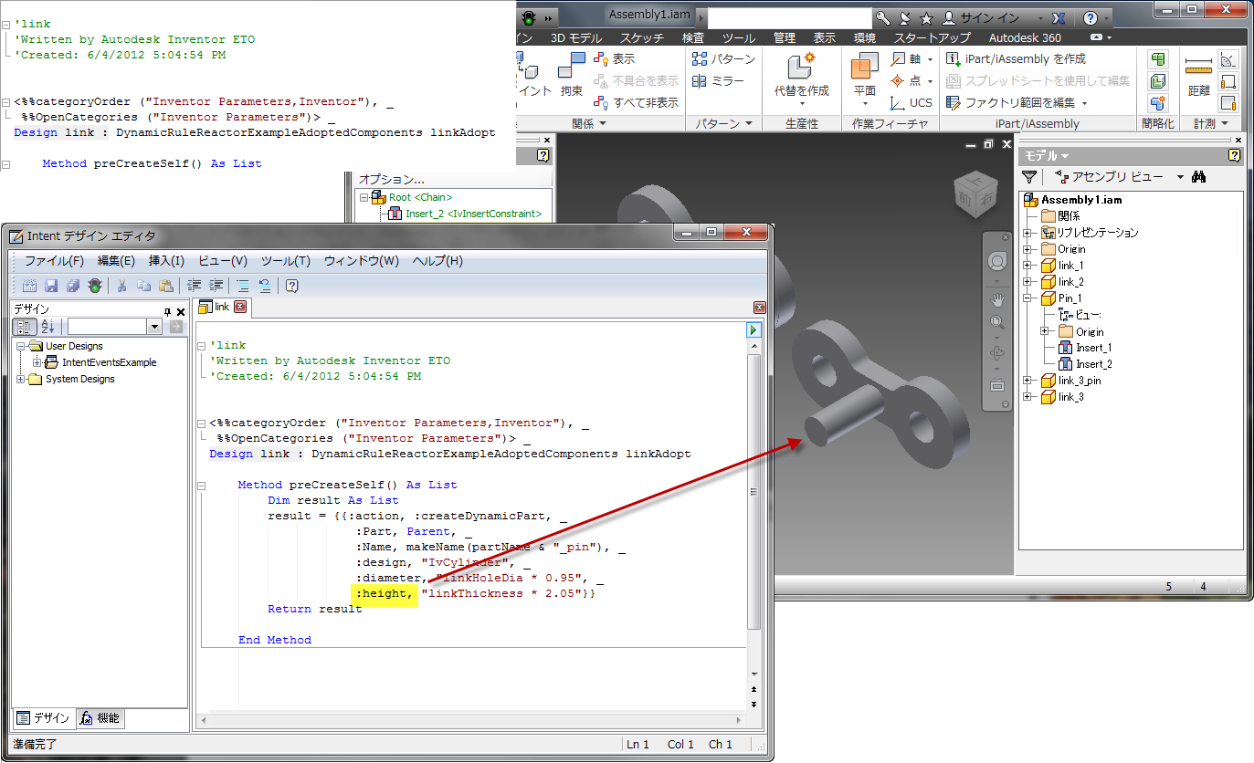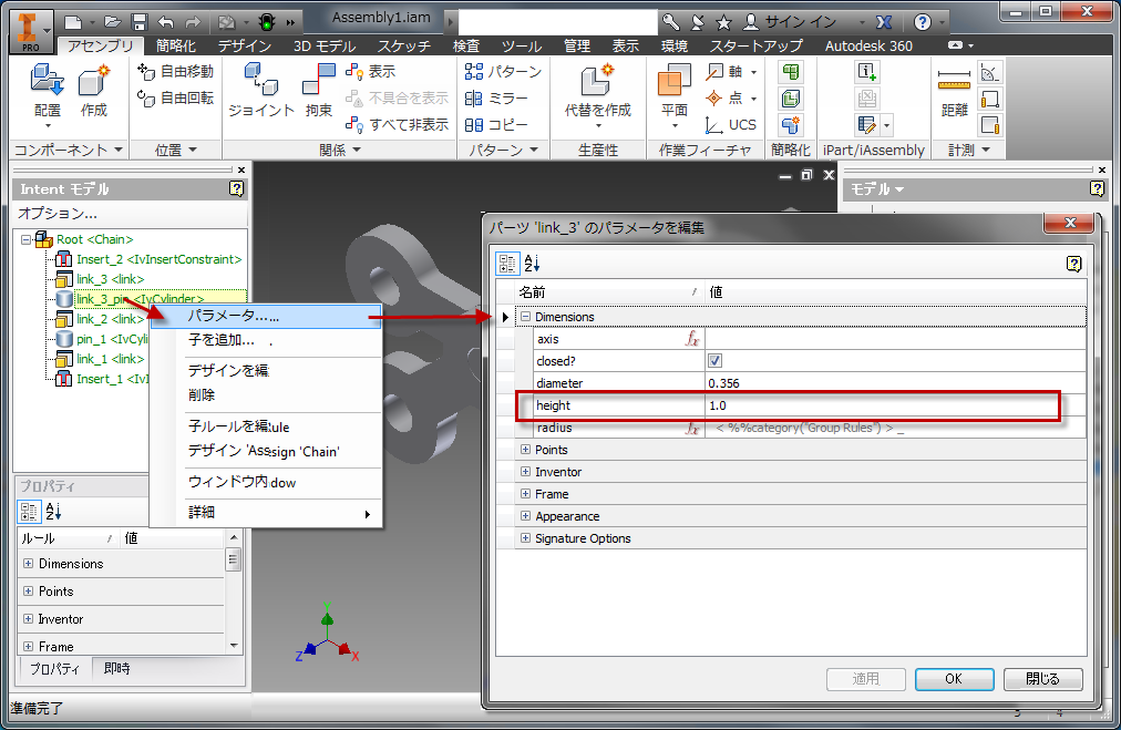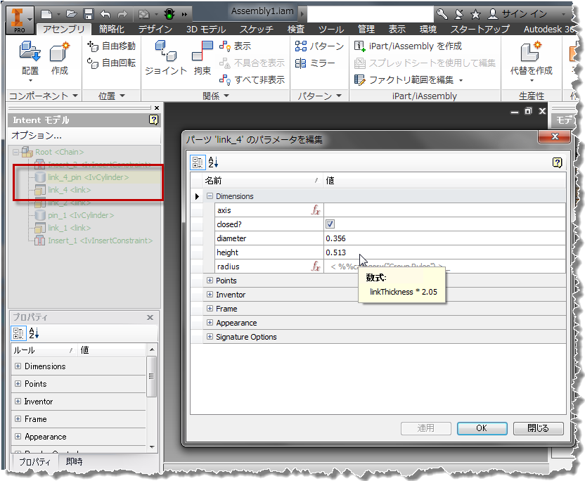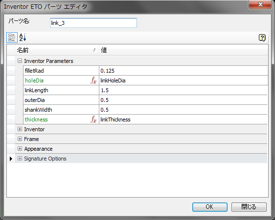 ここで[子を追加]をもう一度使用し、別のリンクの子を挿入してメソッドをテストします。パラメータのダイアログボックスで、holeDia を linkHoleDia に、thickness を linkThickness に設定します。