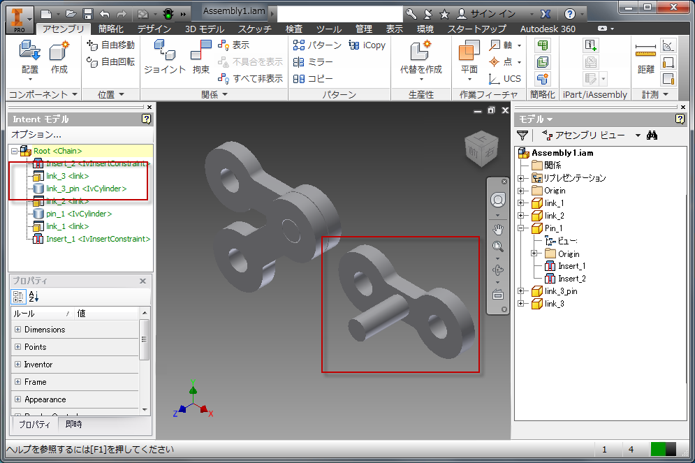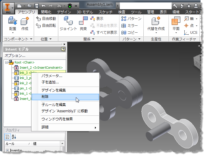 ここで、リンクを追加するたびに追加される "ピン" (円柱)がほしいとします。ピン + 円柱 アセンブリとすることももちろんできますが、その場合は(a)すべてのピンおよびリンクを兄弟として持つこと、および(b)必要がないと判断した場合は特定のピンを削除することができなくなります。