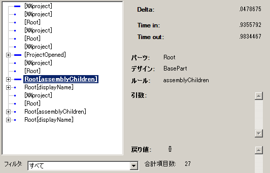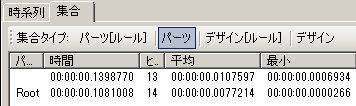 集合ビューは、ルール、パーツ、デザインのメトリック(かかった合計の時間とヒット数)を調査します。たとえば次は、Intent パーツをロードするための呼び出しを示しています。