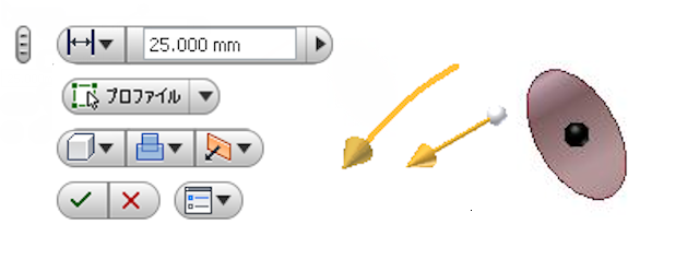 キャンバス内表示は、グラフィックス ウィンドウにオーバーレイ表示され、直接操作をサポートします。キャンバス内表示には通常、コマンド オプション、マニュピュレータ、および値入力ボックスをフィーチャするミニツールバーが含まれています。ミニツールバーによって、3D モデルの直接的かつ予測可能な操作を行えます。キャンバス内表示の下部にある[OK]ボタンと[キャンセル]ボタンにより、操作を確認したりキャンセルします。