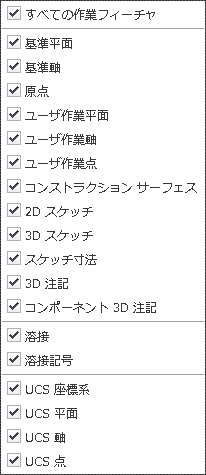 注: 表示の状態は競合することがあります。たとえば、右クリック メニュー オプションを使用して作業平面の表示をオフにした場合、[オブジェクトの表示設定]のドロップダウン リストで作業平面を有効にしても表示されません。競合が発生した場合は、[オブジェクトの表示設定]で要素を有効にしてからブラウザでステータスをチェックします。