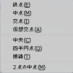 これまでは、右クリック メニューの[点スナップ]で使用可能だったスナップ点は、[中点]、[中心]、[交差]のみでした。次のスナップ点が追加されました。